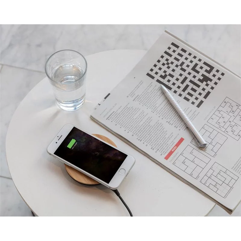 Ce chargeur sans fil avec fonction induction est fabriqué avec un boitier en bambou et tissu (30% cotonbio, 40% chanvre et 30% PET).