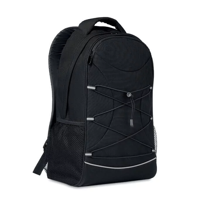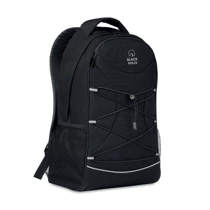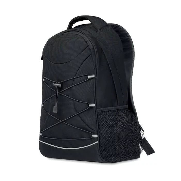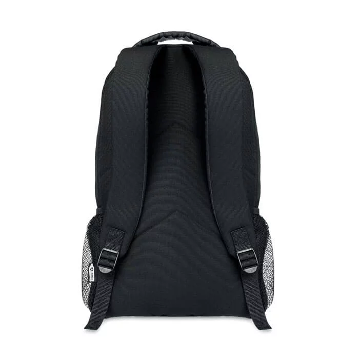 Ce sac à dos personnalisable est fabriqué en RPET recyclé 600D provenant du recyclage des bouteilles d’eau en plastique.
